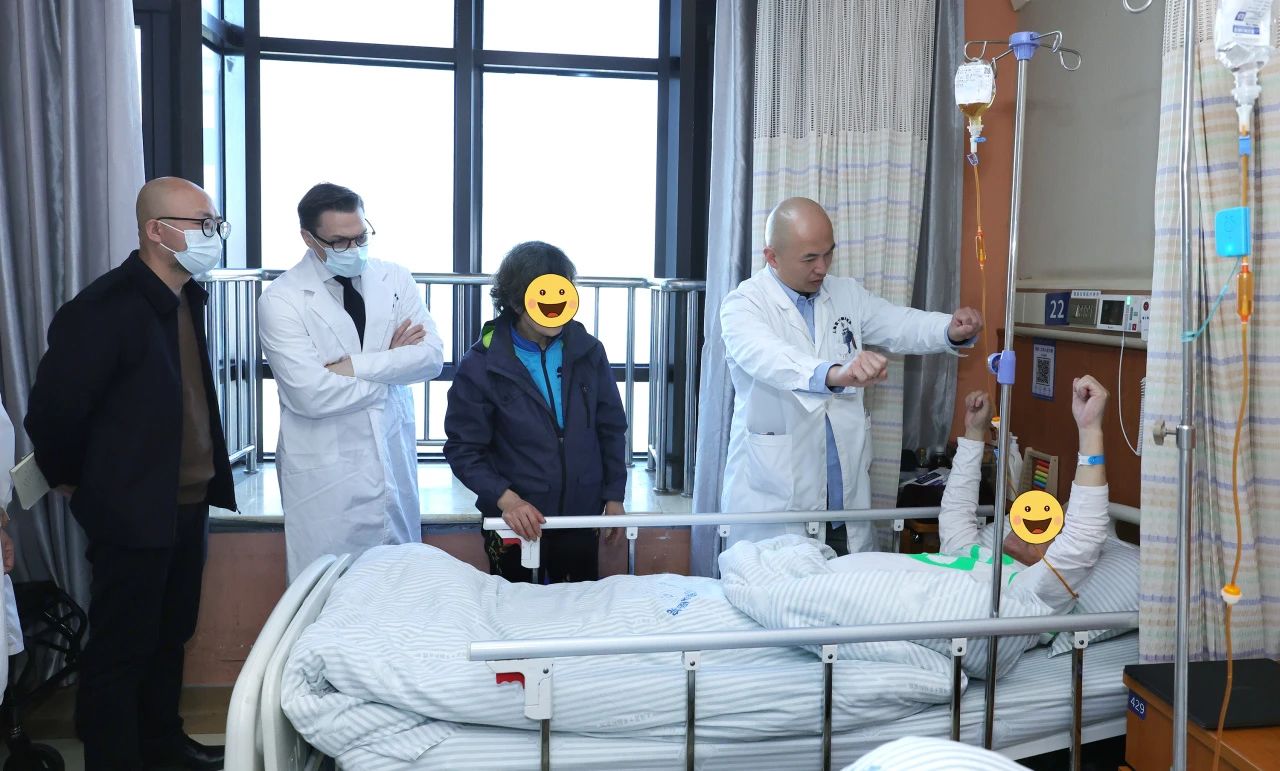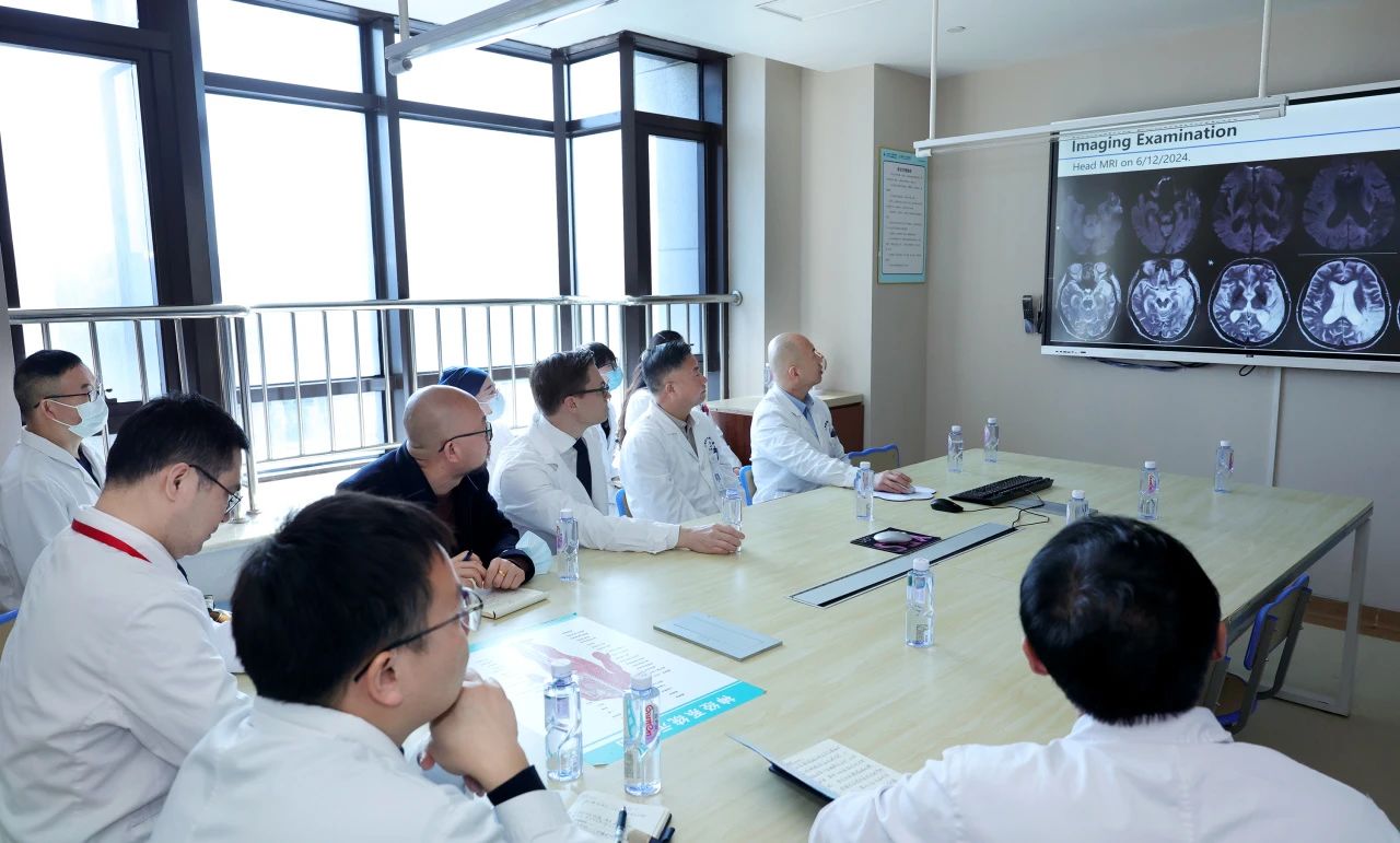 此外,圍繞患者圍手術期管理、DeepSeek及AI醫療技術在神經外科領域的應用前景等熱點話題,雙方還開展了深入探討。與此同時, Sean P.Polster博士在副院長潘耀良等陪同下,來到4A腦血管病一科,與學術副院長兼4F主任席剛明教授,4A腦血管病一科副主任王貴平博士以及科室醫療骨干共同參加查房和討論。