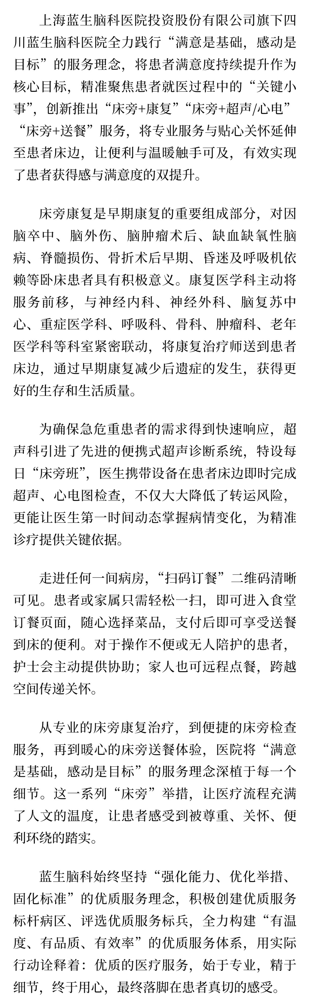 上海藍(lán)生腦科醫(yī)院投資股份有限公司旗下四川藍(lán)生腦科醫(yī)院全力踐行“滿意是基礎(chǔ),感動是目標(biāo)”的服務(wù)理念,將患者滿意度持續(xù)提升作為核心目標(biāo),精準(zhǔn)聚焦患者就醫(yī)過程中的“關(guān)鍵小事”,創(chuàng)新推出“床旁+康復(fù)”“床旁+超聲/心電”“床旁+送餐”服務(wù),將專業(yè)服務(wù)與貼心關(guān)懷延伸至患者床邊,讓便利與溫暖觸手可及,有效實現(xiàn)了患者獲得感與滿意度的雙提升。