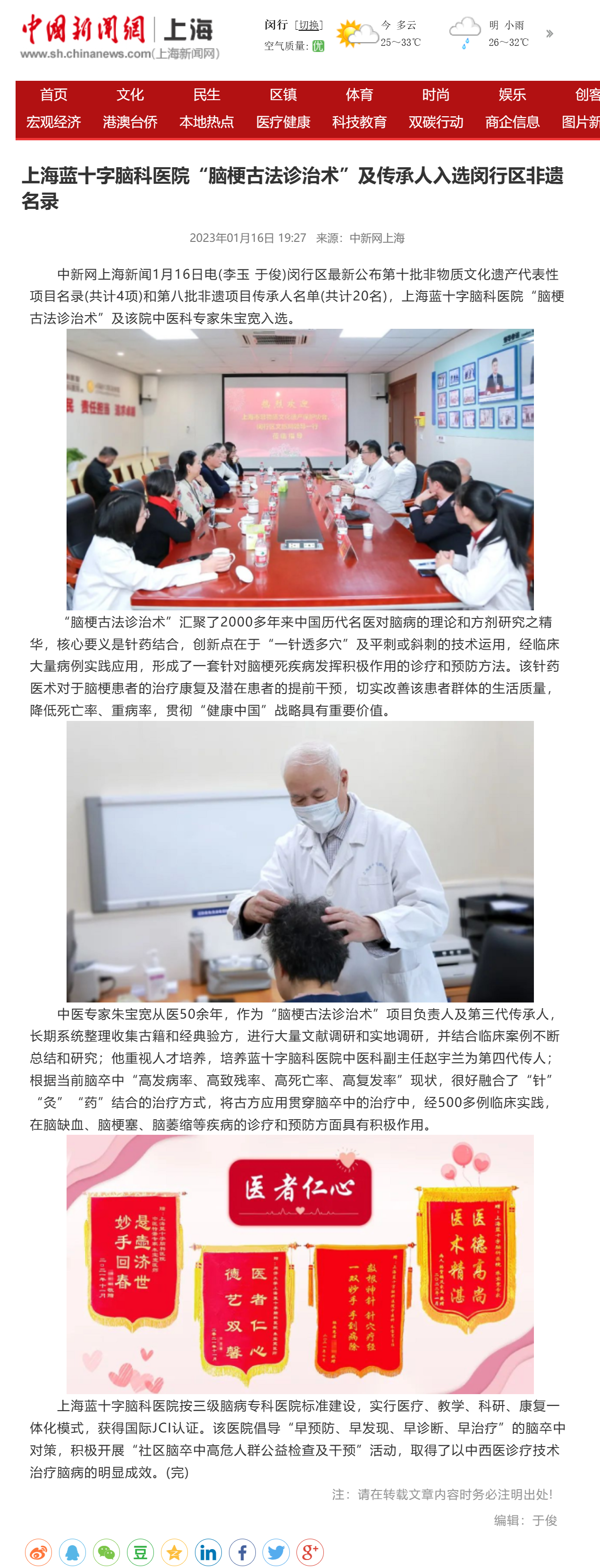 中新網上海新聞1月16日電(李玉 于俊)閔行區最新公布第十批非物質文化遺產代表性項目名錄(共計4項)和第八批非遺項目傳承人名單(共計20名),上海藍十字腦科醫院“腦梗古法診治術”及該院中醫科專家朱寶寬入選。