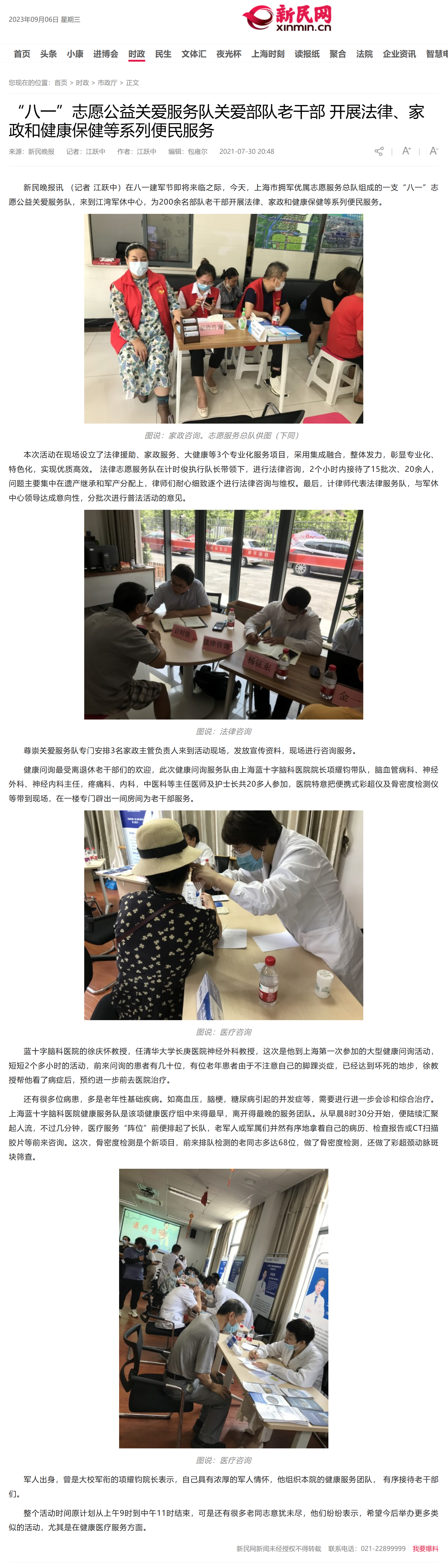 新民晚報訊 (記者 江躍中)在八一建軍節(jié)即將來臨之際,今天,上海市擁軍優(yōu)屬志愿服務總隊組成的一支“八一”志愿公益關愛服務隊,來到江灣軍休中心,為200余名部隊老干部開展法律、家政和健康保健等系列便民服務。