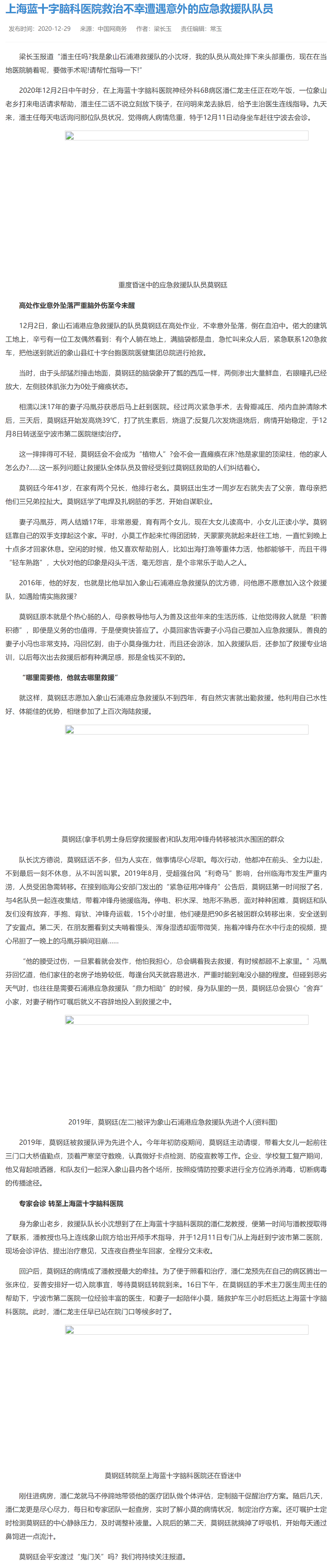 梁長玉報道“潘主任嗎?我是象山石浦港救援隊的小沈呀,我的隊員從高處摔下來頭部重傷,現(xiàn)在在當?shù)蒯t(yī)院躺著呢,要做手術呢!請幫忙指導一下!”