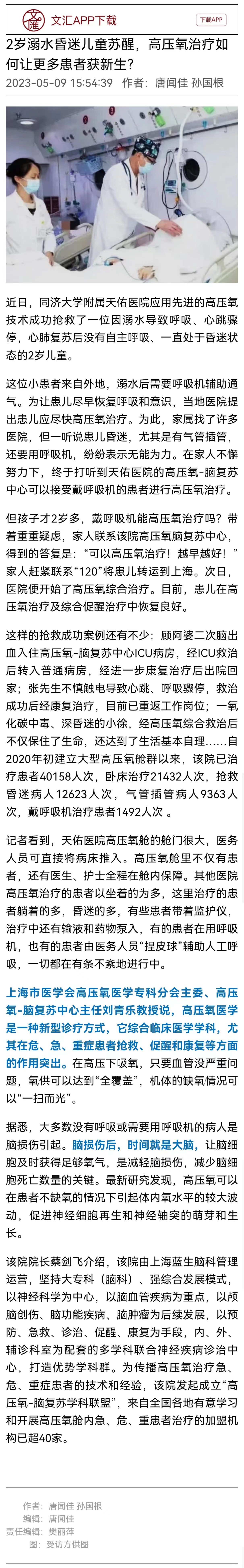 文匯報:2歲溺水昏迷兒童蘇醒,高壓氧治療如何讓更多患者獲新生