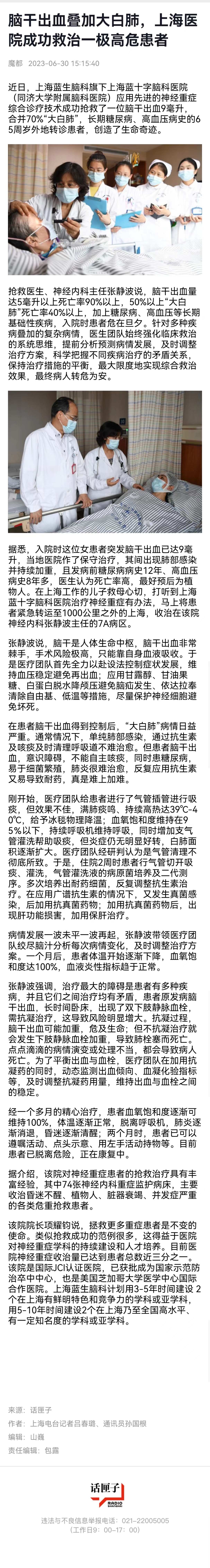 近日,上海藍生腦科旗下上海藍十字腦科醫院(同濟大學附屬腦科醫院)應用先進的神經重癥綜合診療技術成功搶救了一位腦干出血9毫升,合并70%“大白肺”,長期糖尿病、高血壓病史的65周歲外地轉診患者,創造了生命奇跡。