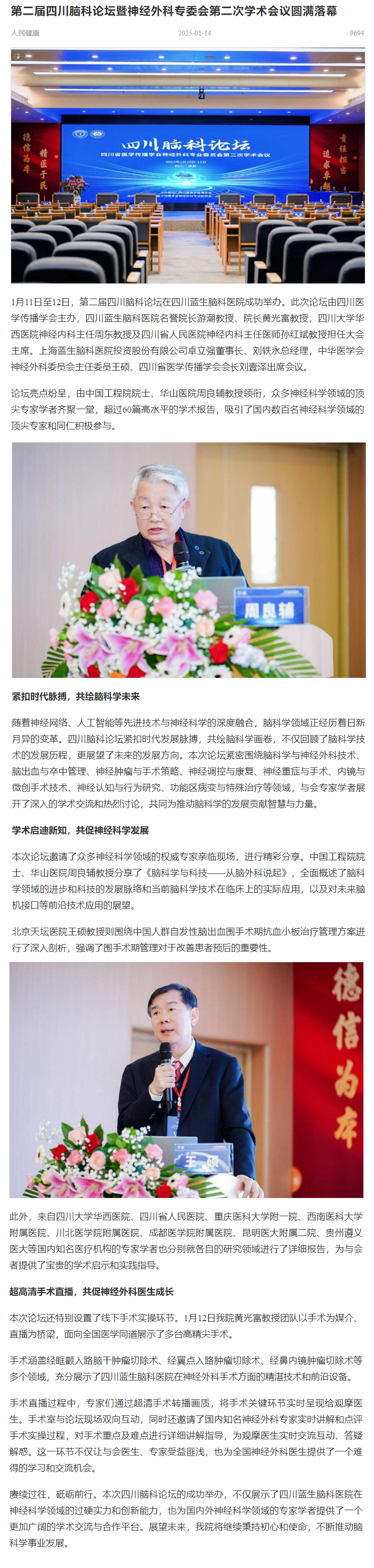 1月11日至12日,第二屆四川腦科論壇在四川藍生腦科醫院成功舉辦。此次論壇由四川醫學傳播學會主辦,四川藍生腦科醫院名譽院長游潮教授、院長黃光富教授,四川大學華西醫院神經內科主任周東教授及四川省人民醫院神經內科主任醫師孫紅斌教授擔任大會主席。上海藍生腦科醫院投資股份有限公司卓立強董事長、劉軼永總經理,中華醫學會神經外科委員會主任委員王碩、四川省醫學傳播學會會長劉壹澤出席會議。