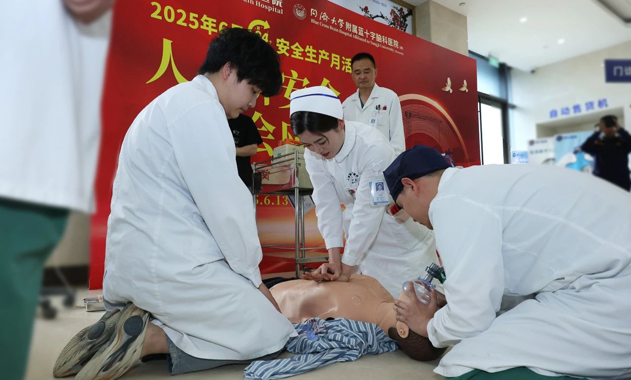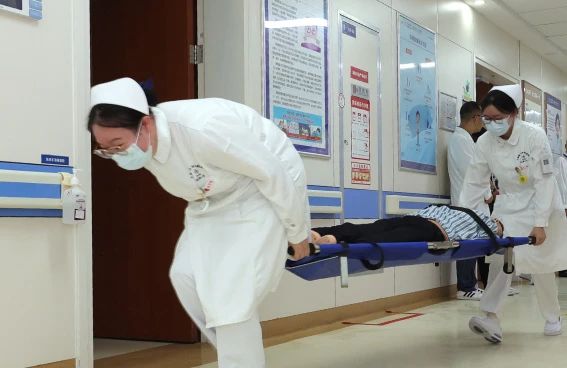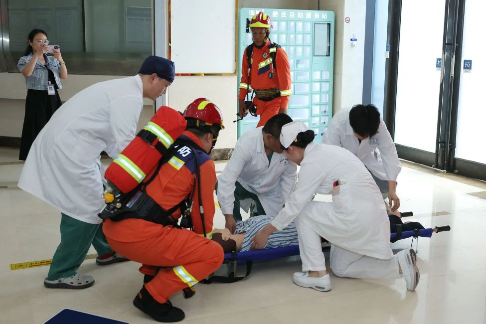 醫(yī)療急救:疏散過程中模擬有患者突發(fā)昏厥。醫(yī)院CPR急救小組迅速就位,實(shí)施現(xiàn)場緊急心肺復(fù)蘇,成功復(fù)蘇“患者”。