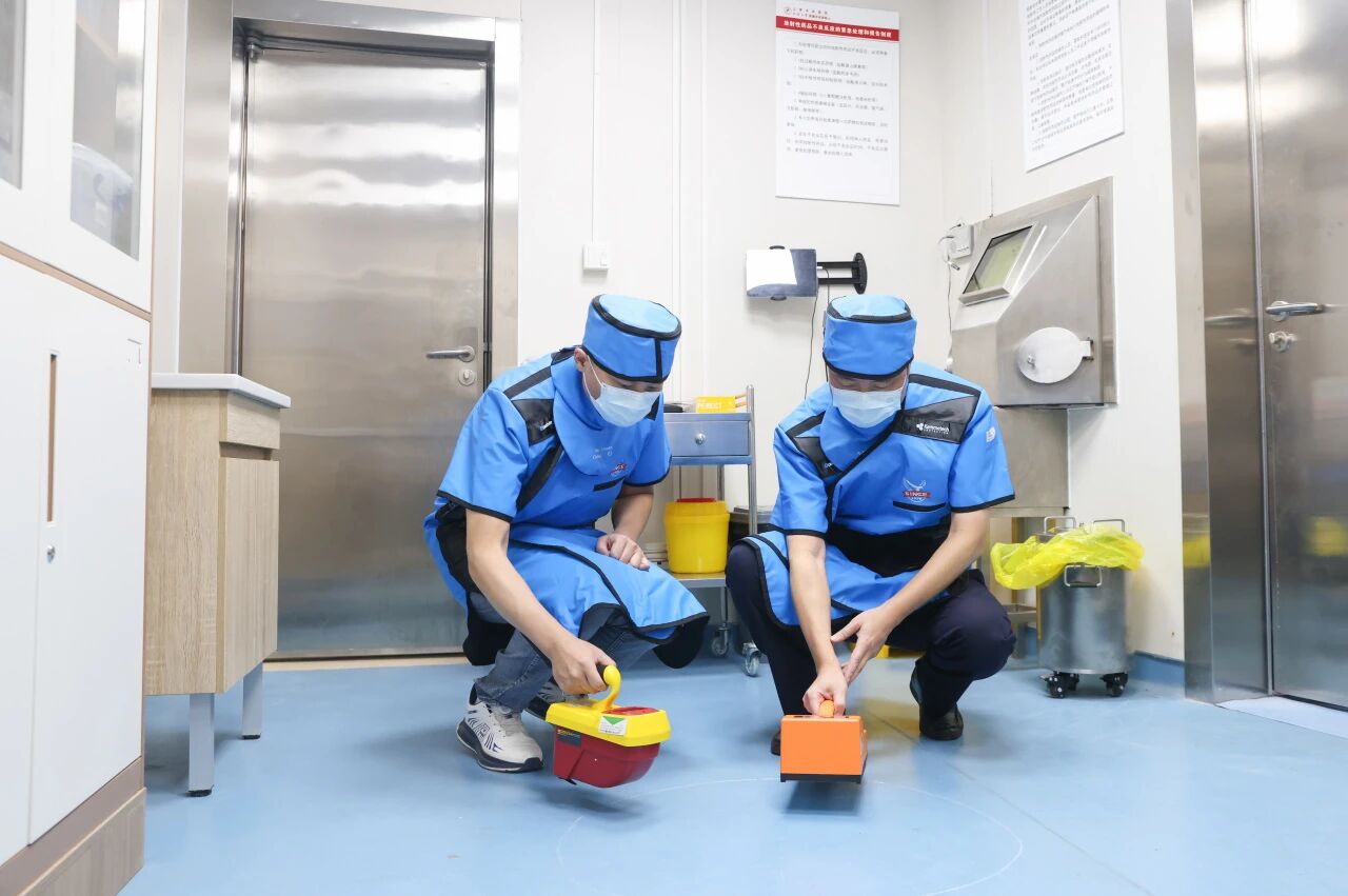 15點15分,普陀區生態環境局、普陀區疾控中心(區衛監所)、普陀區公安分局治安支隊人員同時到場。生態環境局應急處置人員穿戴好防護裝備,手持輻射監測儀,從PET-CT室大門口向內進行輻射監測。