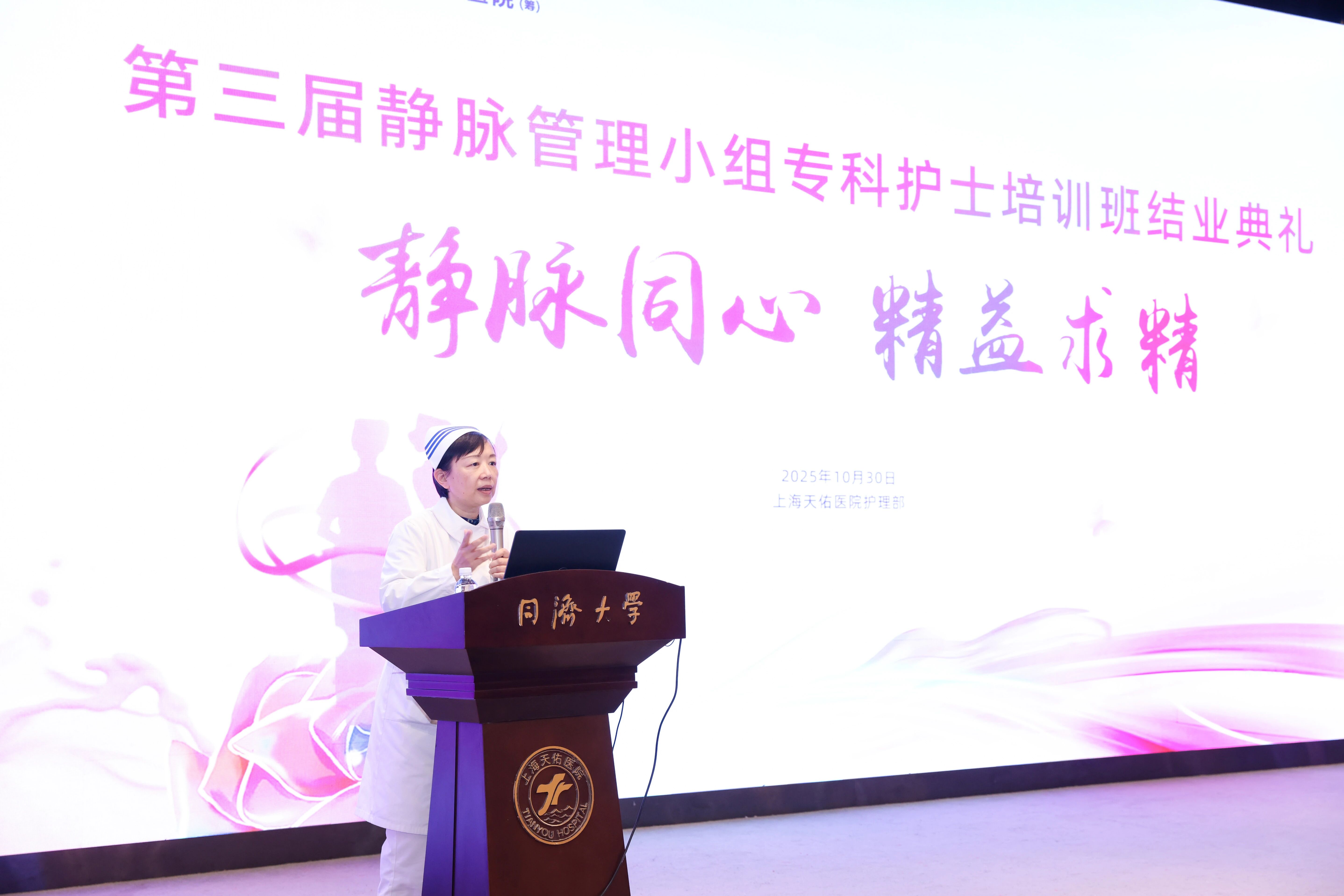 在結業典禮上,劉瑋琳主任向順利結業的學員表示祝賀,對本次靜脈管理??谱o士培訓班取得的成果表示肯定。她指出,培訓中的“項目展示”環節是臨床護理教學模式的一次創新,不僅激發了學員的自主學習與團隊協作能力,也為今后的??婆嘤柼峁┝朔独?。她強調,培訓的目的在于系統提升護士的專業技能與實踐能力,證書是能力的證明而非終點,大家要踐行“以學促干”的理念,將所學知識內化于心、外化于行,持續提升專業素養,為患者提供優質的??谱o理服務。