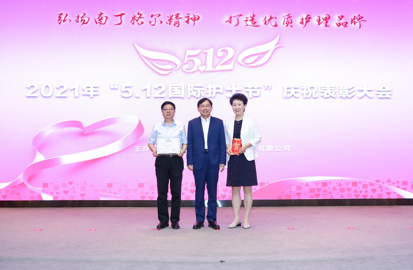 公司陳樹林書記宣讀《關于表彰公司2021年首屆藍生護士長技能大賽獲獎單位和選手的通報》和《關于表彰公司2021年優秀護士的通報》。公司領導為受表彰的單位和個人頒發證書、獎金并合影留念。