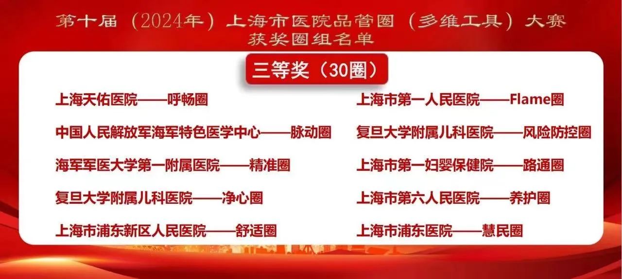 上海天佑醫院運用品管圈工具的這些年,切實有效地幫助臨床一線醫務人員掌握了PDCA的循環手法,讓他們能在工作中及時發現問題、科學分析原因、高效解決問題,醫院的管理團隊管理能力更強了,醫療質量、服務能級等各方面都得到了顯著提升。在2024第三屆全國醫院醫療服務質量管理(PDCA)案例交流大會·醫療服務質量管理(PDCA)案例總決賽中,榮獲二等獎2項、三等獎2項的優異成績。未來,公司旗下醫院將持續優化、深化品管圈活動,把品管圈活動與服務能力相結合,推進醫療質量和安全管理的科學化、規范化,助推醫院高質量發展。