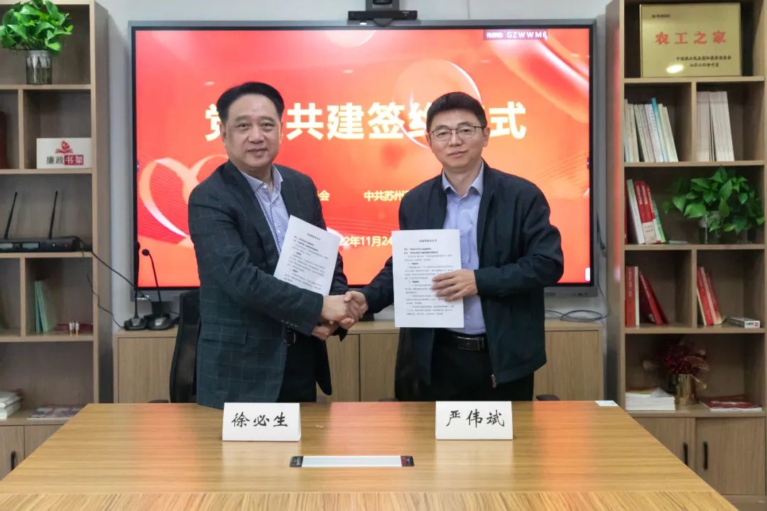 中共蘇州藍十字腦科醫院支部委員會書記、院長徐必生和中共蘇州市中心血站委員會書記、站長嚴偉斌分別就各自組織成立時間、人員情況、亮點工作進行了簡要介紹,并確定了本次共建內容以及共建目標。隨后,雙方黨組織書記在全體參會人員的共同見證下簽訂了《黨建聯建協議書》。