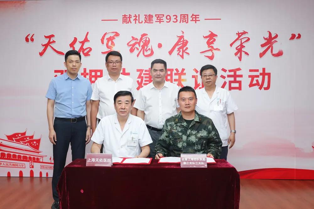 執行院長王強代表天佑醫院與武警上海總隊執勤第三支隊二大隊共建簽約,醫院雙擁共建再添新成員。