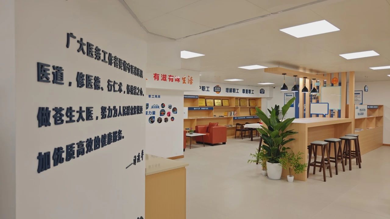 職工之家位于醫院4號樓六樓,設計巧妙融合了現代簡約與傳統美學,為職工打造了一個集休息、學習、交流與放松于一體的全方位多功能空間。這里設有舒適的休閑區,供職工放松疲憊身心;運動區配備了齊全的健身設施,鼓勵職工保持活力與健康;溫馨的閱讀角則提供了豐富的醫學書籍與人文讀物,滋養心靈,拓寬視野。
