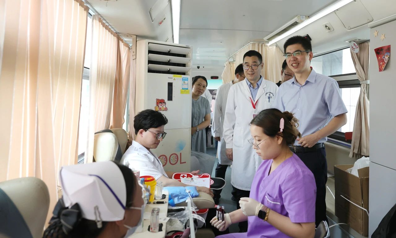 采血過程中,閔行區健康促進中心副主任朱斌和醫院副院長潘耀良等領導登上無償獻血車,親切看望慰問大家,感謝大家的無私奉獻,叮囑大家獻血后要注意休息。