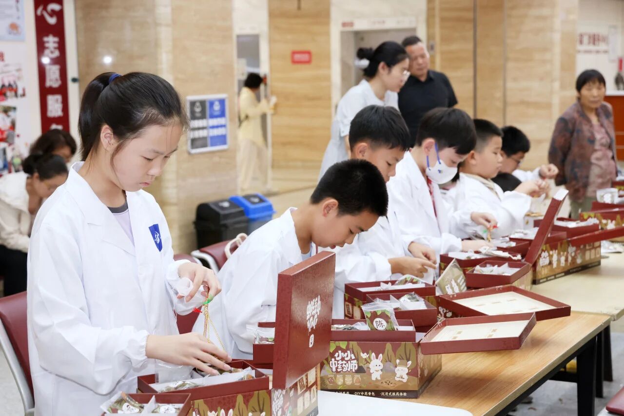 每個(gè)孩子的桌前,都整齊擺放著醫(yī)院特別準(zhǔn)備的“小小中藥師”香囊制作箱。箱內(nèi)不僅有八種常用藥材原料包,還配有仿古銅桿秤、木質(zhì)搗藥臼、古風(fēng)包藥紙和香囊袋,孩子們可以完整體驗(yàn)傳統(tǒng)中藥材香囊的制作流程,沉浸式體驗(yàn)中醫(yī)文化的博大精深。
