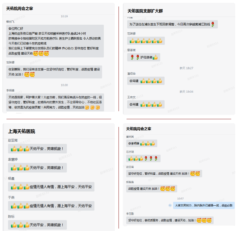 全院員工在了解到醫(yī)療隊快速奔赴一線后,紛紛通過微信留言,為戰(zhàn)友們加油鼓勁。很多員工表示隨時準備著,只要有需要,隨時出征,為普陀、為上海抗疫作出應有的貢獻。