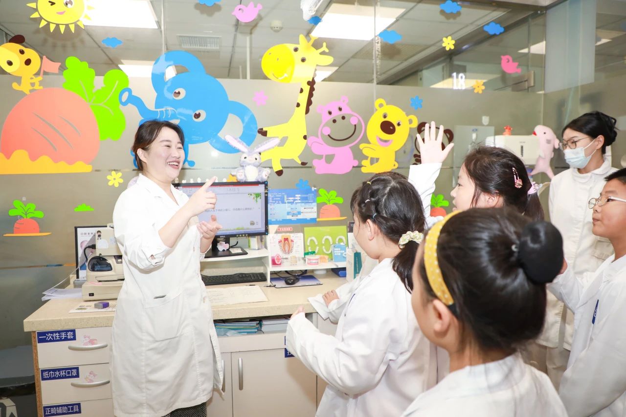 下午2:30,孩子們穿上了定制的白大褂,興奮地聚集在門診大廳,拍完了美美的合影,“小醫(yī)生”們就迫不及待地“上崗”了。
