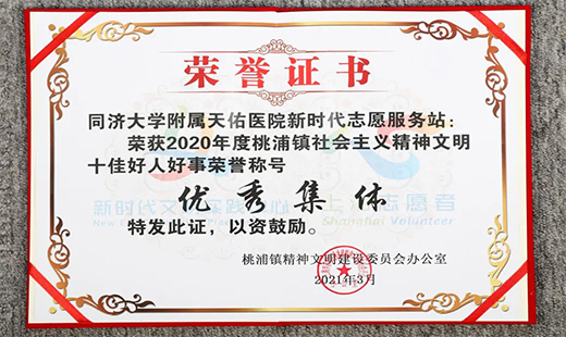上海天佑醫(yī)院志愿服務(wù)站獲桃浦鎮(zhèn)“十佳好人好事”優(yōu)秀集體稱號